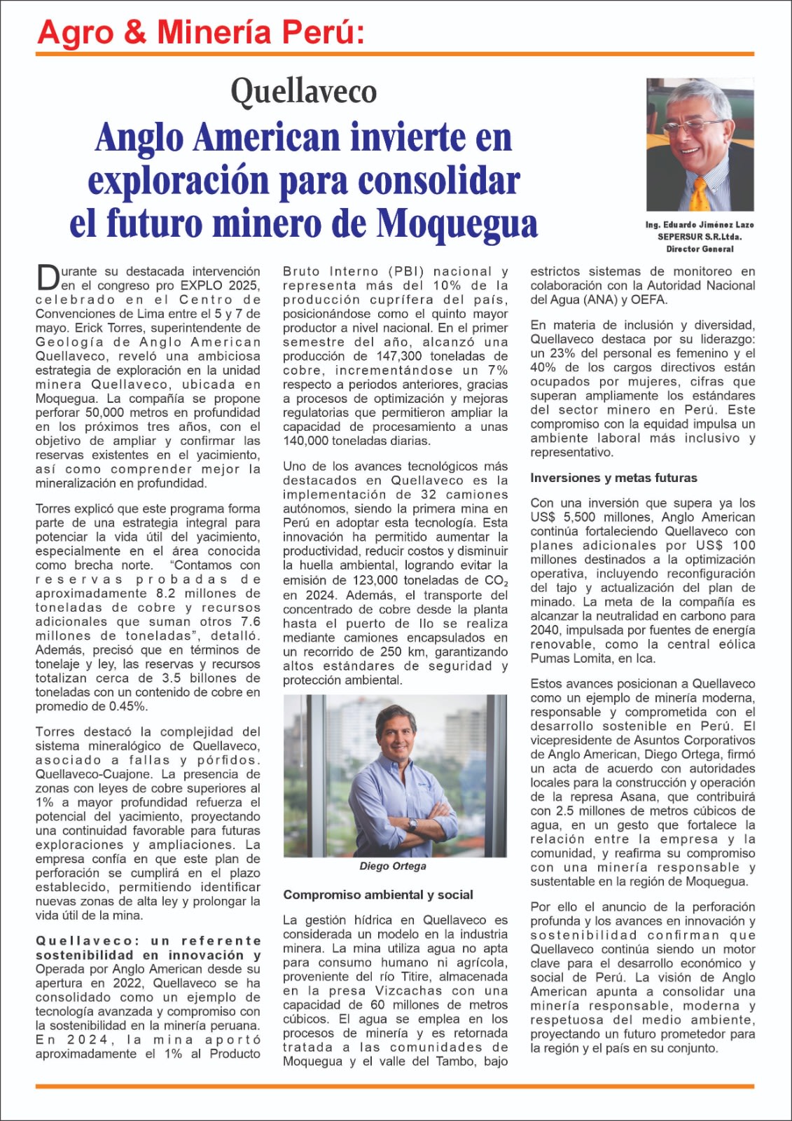 Quellaveco: un referente sostenibilidad en innovación y Operada por Anglo American desde su apertura en 2022, Quellaveco se ha consolidado como un ejemplo de tecnología avanzada y compromiso con la sostenibilidad en la minería peruana. En 2024, la mina aportó aproximadamente el 1% al Producto Bruto Interno (PBI) nacional y representa más del 10% de la producción cuprífera del país, posicionándose como el quinto mayor productor a nivel nacional. En el primer semestre del año, alcanzó una producción de 147,300 toneladas de cobre, incrementándose un 7% respecto a periodos anteriores, gracias a procesos de optimización y mejoras regulatorias que permitieron ampliar la capacidad de procesamiento a unas 140,000 toneladas diarias.